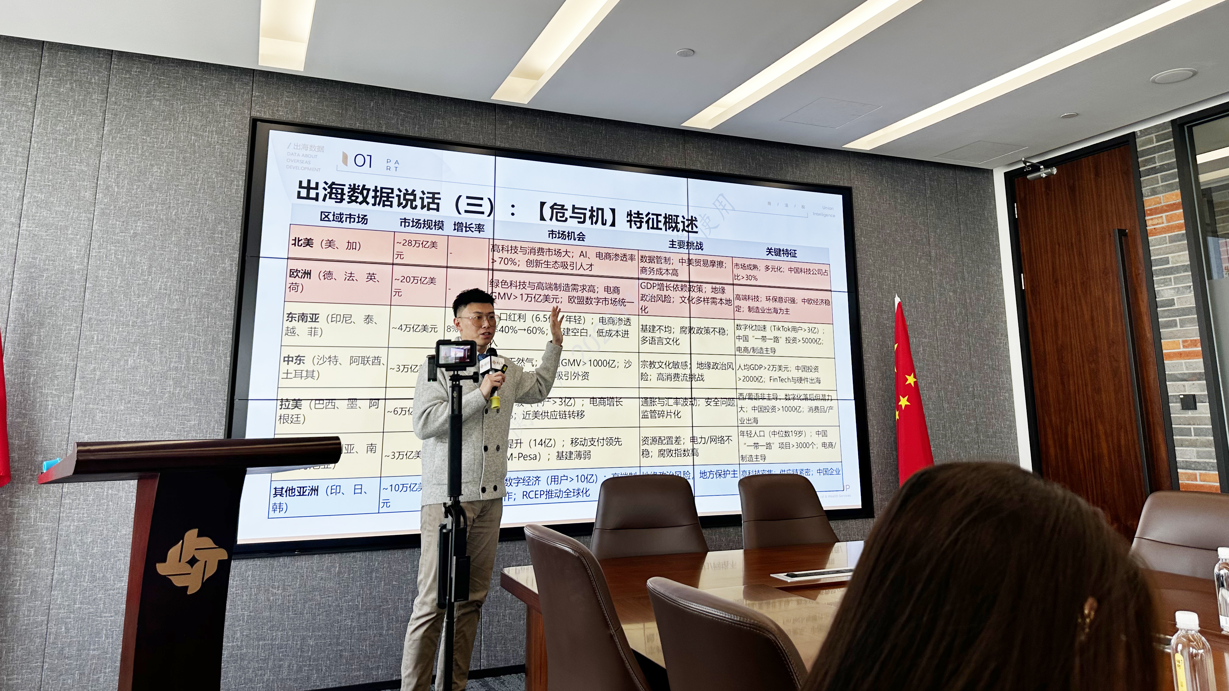 讲座的第一部分,将宏观趋势拆解为可视化结构,帮助大家从“地理出海”转向“结构出海”的思维框架。一张对比全球主要区域市场特征的图表,打破了“出海目的地差别不大”的传统认知: